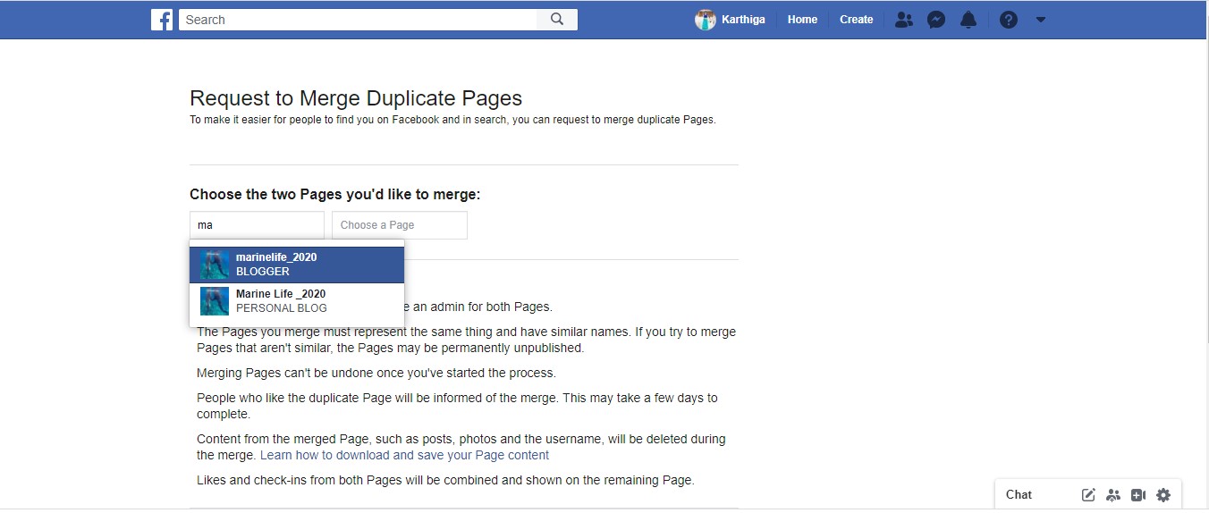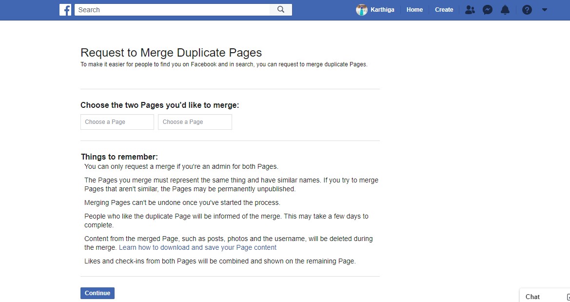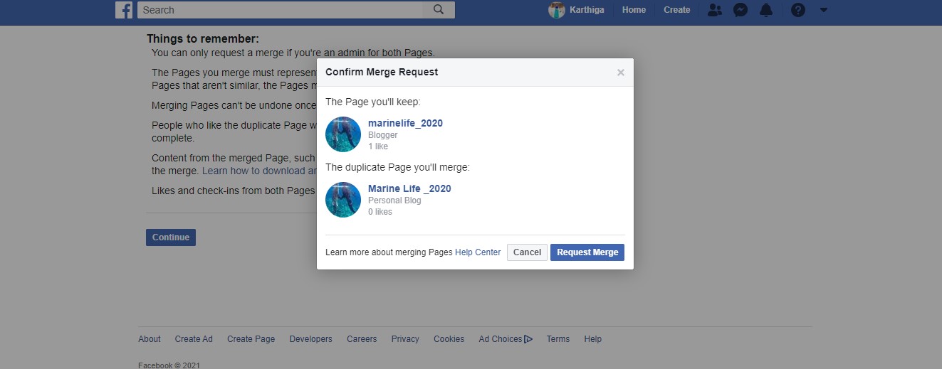 - If you don’t see the option to merge the Facebook Pages, then request Facebook.
